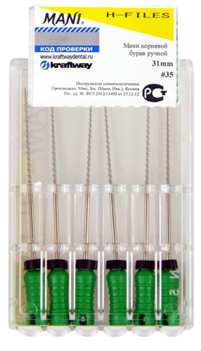 Н-файл № 35 Mani – эндодонтический инструмент длиной 31 мм, применяемый для финишной обработки зубных каналов. Работа осуществляется поступательными пилящими движениями, что помогает правильно сформовать профиль.